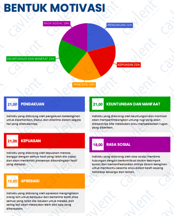 Ada 5 motivasi dasar yg mendorong seseorang dalam bekerja, dimana masing-masing motivasi ini ada yang sangat dominan, atau cenderung merata dan berimbang (metode tes CAVLENT dapat mengukur hal ini). 5 jenis motivasi tersebut yaitu.